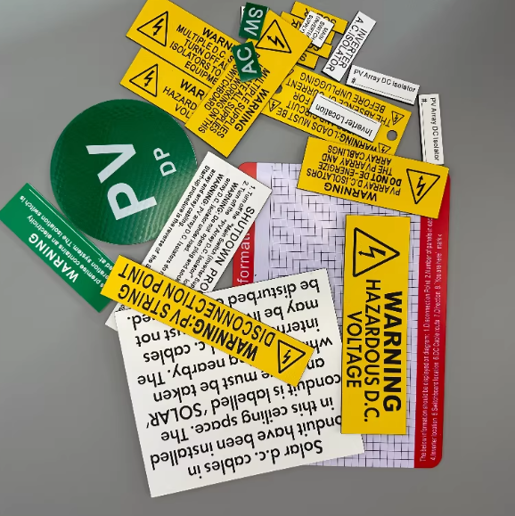 1. Signalisation et identification : plaques signalétiques, panneaux de porte, avertissements de sécurité, étiquettes d'actifs